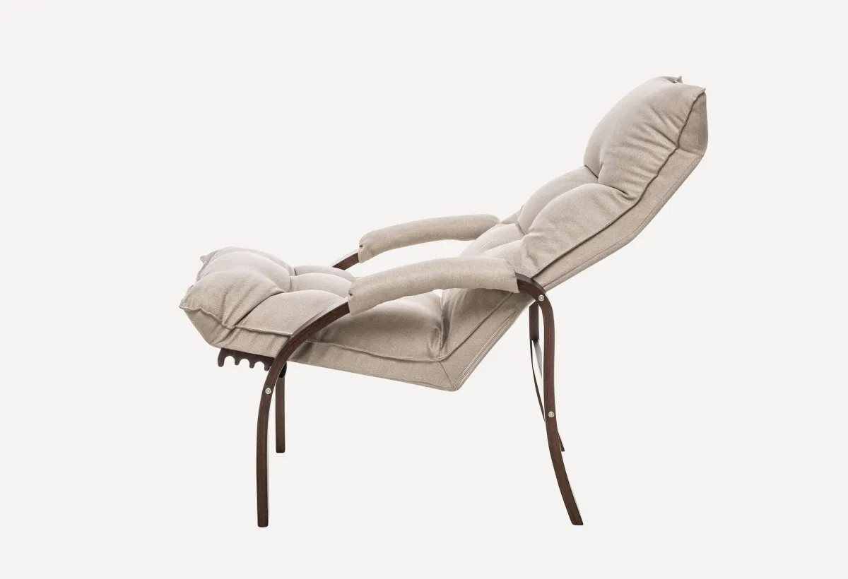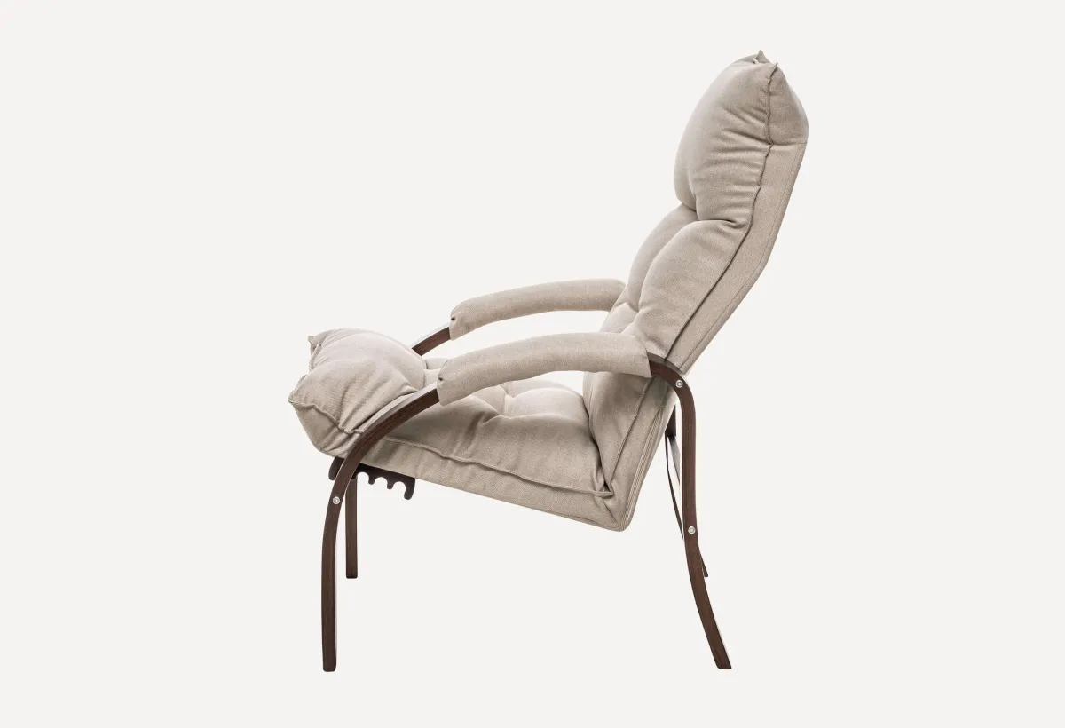 Кресло-трансформер Лесет LevadaМягкое кресло для отдыха дома и на даче Левада сделает комфортным интерьер комнаты модерн или хай-тек. Стильные кресла трансформеры из гнутоклееной коллекции мягкой мебели Leset имеют характерный силуэт, функциональны и компактны, поэтому популярны среди самых требовательных покупателей. Кресло-стул с подлокотниками и уютным сиденьем уместно в спальне, гостиной, прихожей, на балконе, в закрытой дачной беседке. У основания кресло раскладное и оснащено механизмом гребенка, за счет чего одним движением спинка переключается в 2 положения: сидя или полулежа. Этим модель напоминает шезлонг, но Левада Leset -полноценное интерьерное кресло для отдыха с современном дизайне: изящный деревянный каркас под итальянским лаком, велюровый чехол, наполнитель из эластичного пенополиуретана. Накладки на подлокотниках снимаются для чистки, приспинная подушка декорирована пуговицами. Эргономичное каркасное кресло-раскладушка выдержит до 120 кг.