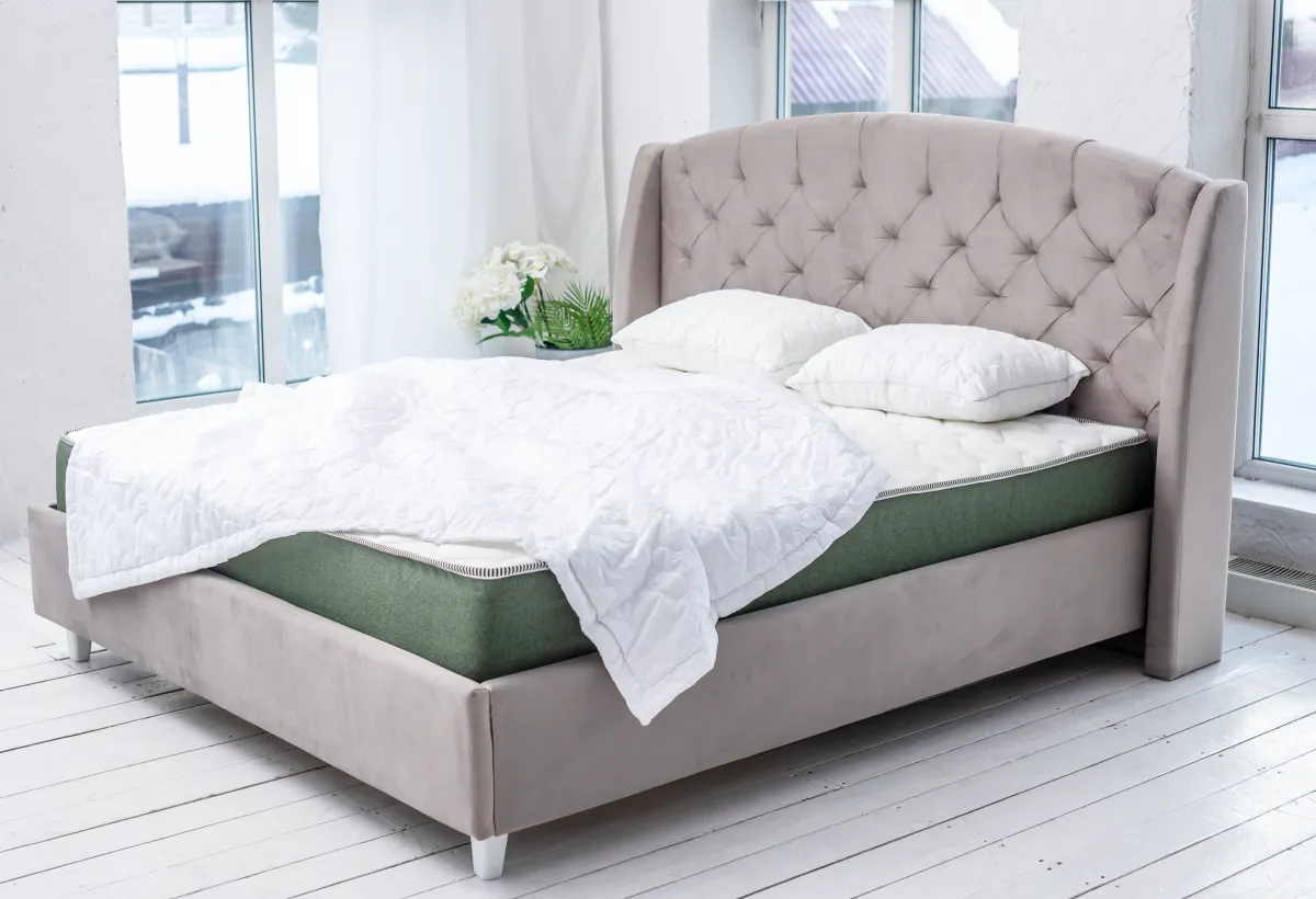 Характеристики кроватиКровать имеет высоту 1300 мм, что делает её универсальной для матрасов любой высоты, особенно эффектно она смотрится с матрасами выше 25 см. Изголовье оснащено объемной каретной стяжкой на поролоне толщиной 40 мм, выполненной вручную. Каркас изголовья надежный и легкий, изготовлен из бруска и МДФ толщиной 10 мм. Опоры высотой 100 мм облегчают уборку под кроватью. Ушки изголовья съемные, что экономит на транспортировке и упрощает сборку. Царги кровати выполнены из ЛДСП белого цвета, что придает ей эстетичный вид. Чехол крепится к царгам при помощи ложного канта, благодаря чему скобы остаются незаметными. Обратная сторона изголовья выполнена из прочного нетканого материала «Файбер текс», что также добавляет эстетичности.