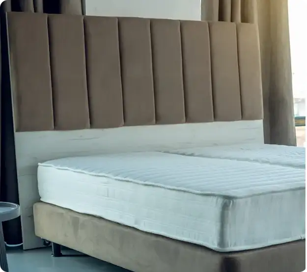 Нижняя часть изголовья изготовлена из ЛДСП белого цвета с фактурой под дерево, что придаёт изделию лёгкость, современность и устойчивость к внешним воздействиям. Такой контраст текстур — мягкой ткани и прочного ЛДСП — делает изголовье не только стильным, но и долговечным.